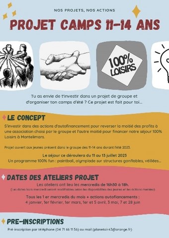 Le projet de l’année 2023 consiste à organiser des actions d’autofinancement. Le bénéfice de celles-ci auront deux objectifs : faire un don à l’association choisit par les jeunes et diminuer le coup de leur séjour d’été. Pour plus d’information n’hésitez pas à joindre directement la structure ou à vous renseigner auprès des animateurs.Face aux attentes des 11-14 ans et à leur enthousiasme pour les projets collectifs, il leur est proposé chaque année un projet participatif.